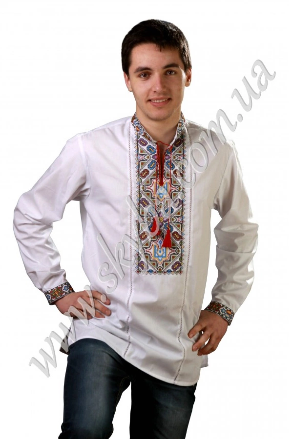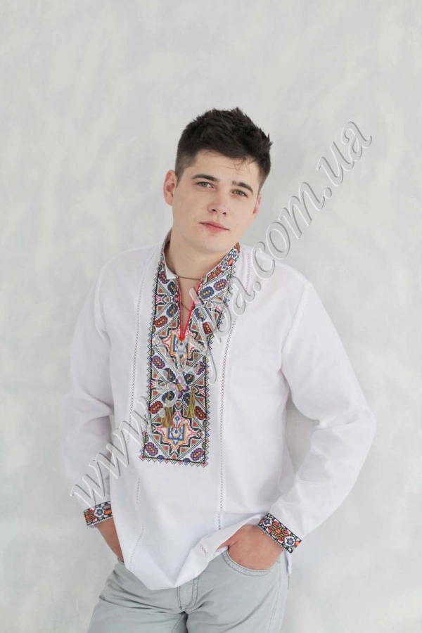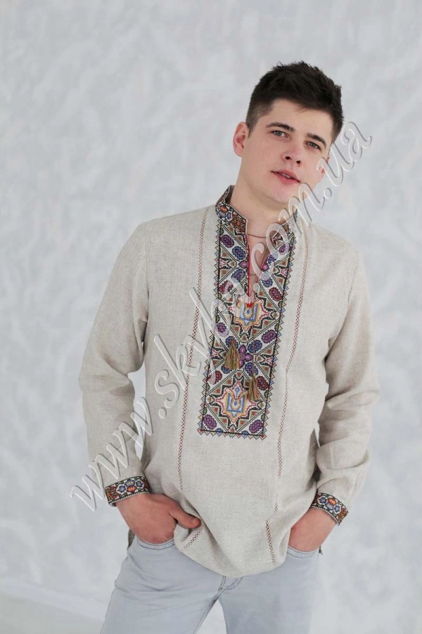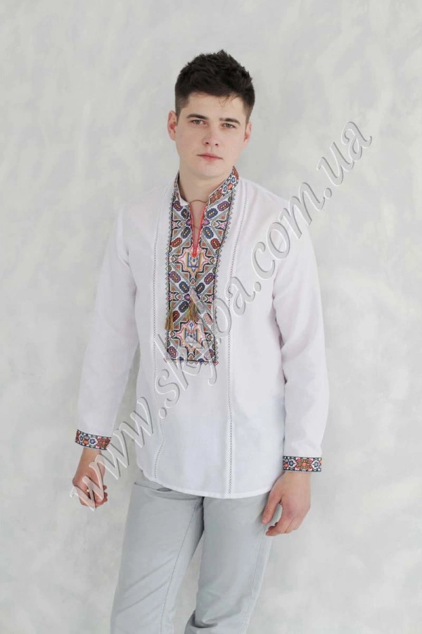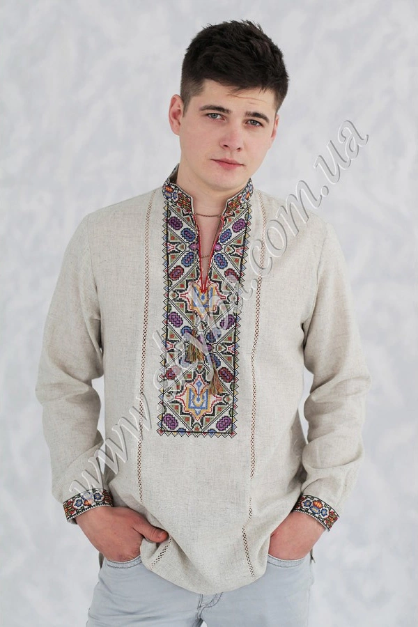Чоловіча сорочка вишиванка з довгими рукавами, прикрашеними вишитими манжетами, стане ідеальний вибором для створення власного неповторного стилю. На грудях також сорочку прикрашає розкішна вишивка, яка є на комірці-стійці та манжетах. Додатково сорочка доповнена тонкою боковою мережкою з двох сторін.
