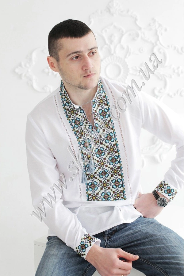 Чоловіча сорочка вишиванка з довгими рукавами прикрашена вишитими манжетами та невеличким комірцем-стійкою. Вишивка на грудях виконано дизайнерами інтернет-магазину «Скиба» спеціально для даного виробу. Прикрашає виріб також тоненька мережка по усій довжині.
