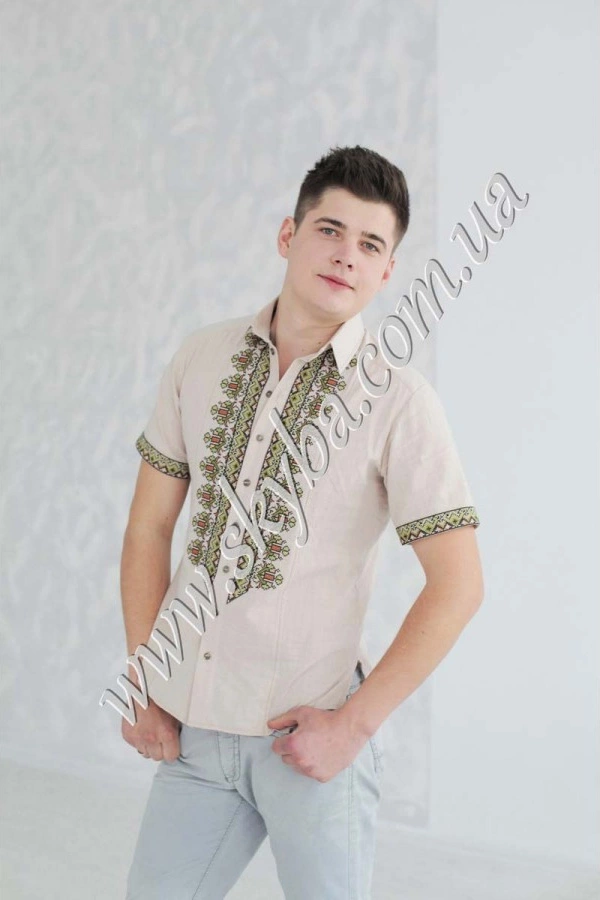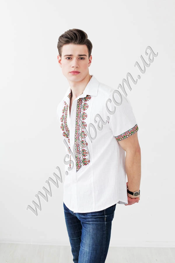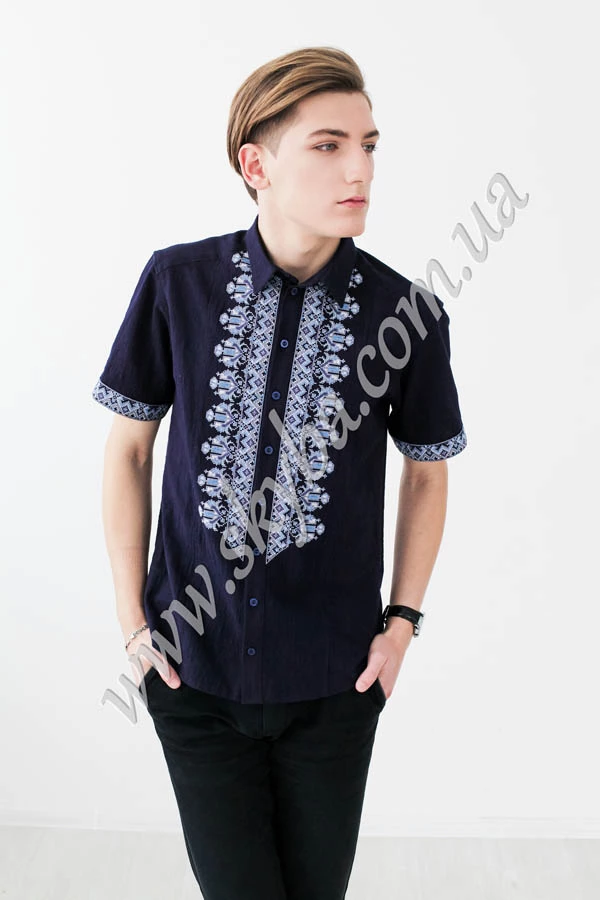 Літня чоловічка сорочка з короткими рукавами на ґудзиках чудово виглядає у поєднанні з класичними брюками, джинсами та навіть шортами. Комірець на стійці додає стриманості виробу, а дизайнерська вишивка робить акценти на неповторності зовнішнього вигляду даної моделі. Краї рукавів також прикрашено вишивкою.