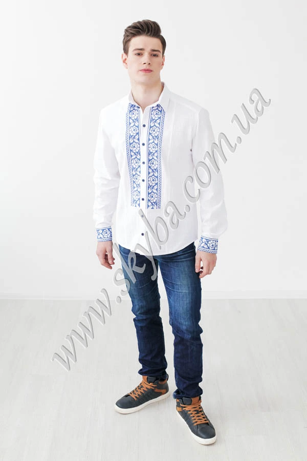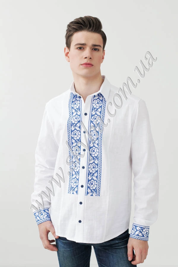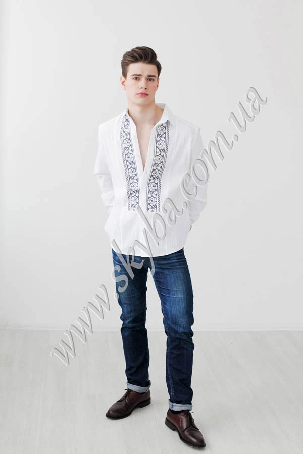 Сучасна чоловічка сорочка на ґудзиках чудово виглядає у поєднанні з класичними брюками, джинсами та навіть шортами. Комірець на стійці додає стриманості виробу, а дизайнерська вишивка робить акценти на неповторності зовнішнього вигляду даної моделі. Краї рукавів також прикрашено вишивкою.