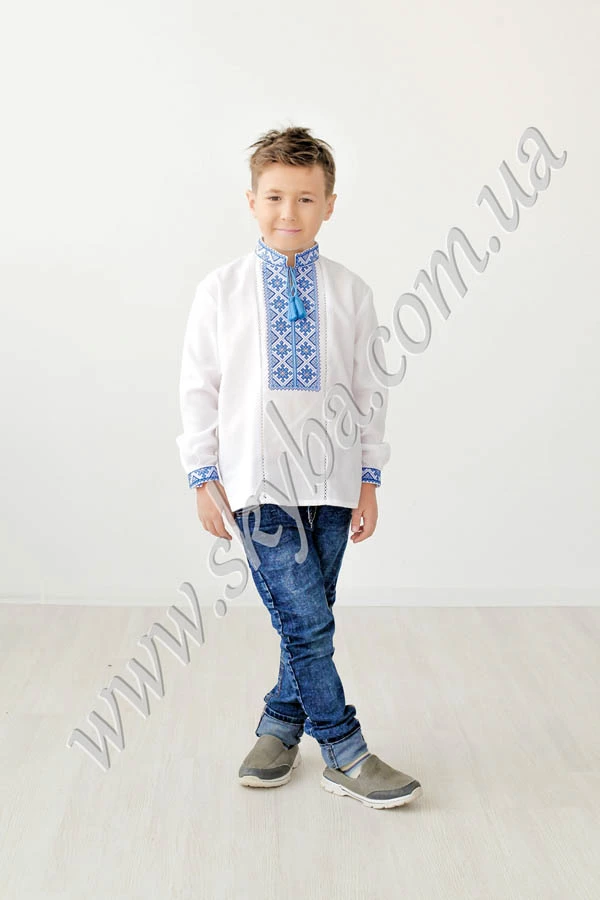 Сорочка вишиванка для хлопчика прямого силуету та з довгими рукавами – універсальний виріб для поєднанні зі шкільною формою та створення святкового образу. Прикрашено сорочку дизайнерською вишивкою, розшитими манжетами та тонкою горизонтальною мережкою по усій довжині виробу.