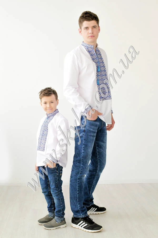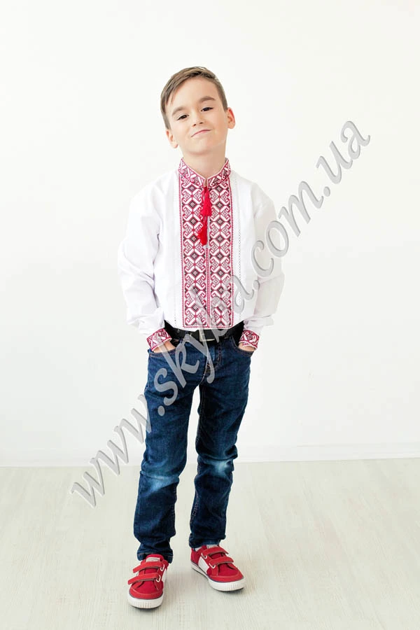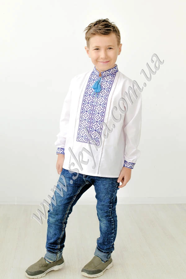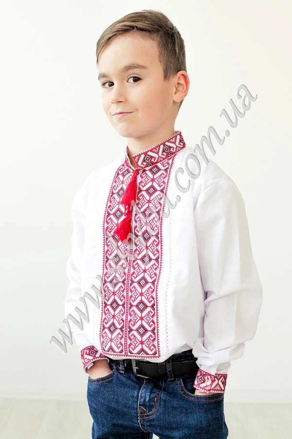 Сорочка для хлопчика з багатою дизайнерською вишивкою буде гармонійно виглядати як з класичними брюками, так і з улюбленими джинсами. Комірець-стійка додає вишуканості виробу, а наявність розшитих манжетів робить зовнішній вигляд сорочки багатим та розкішним.