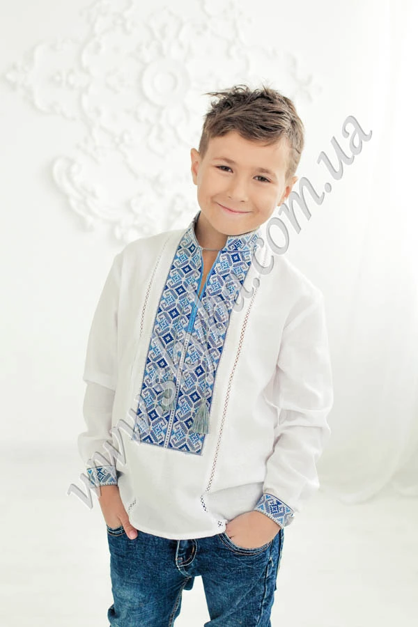 Сорочка для хлопчика з багатою дизайнерською вишивкою, що вишита за технікою аплікація, що робить орнамент більш виразнішим та констраснішим. Комірець-стійка додає вишуканості виробу, а наявність розшитих манжетів робить зовнішній вигляд сорочки багатим та розкішним.