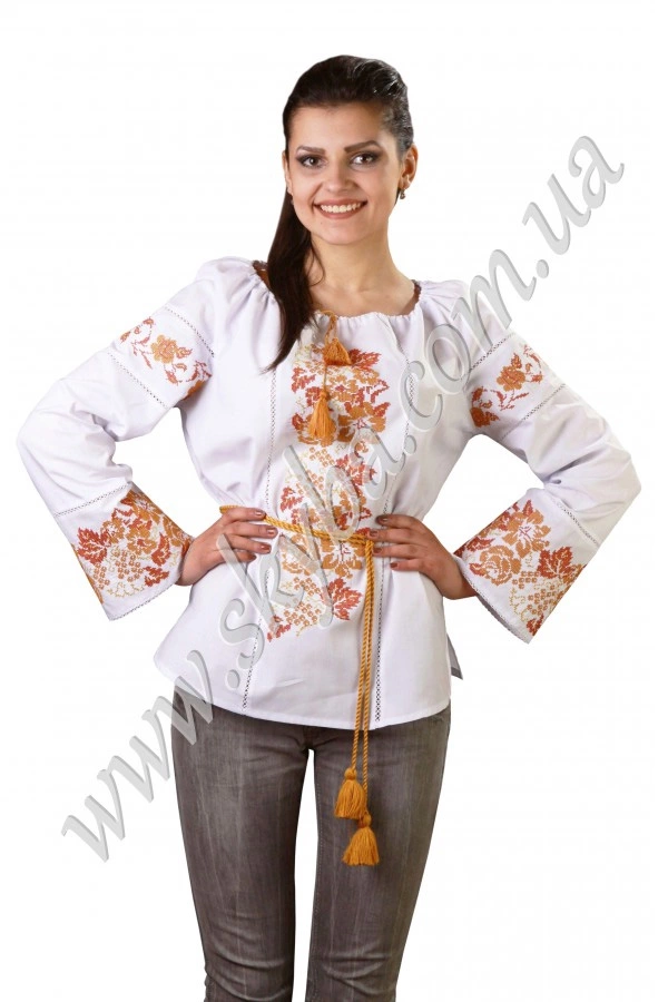 Жіноча класична блуза з дизайнерскою машинною вишивкою дозволить створювати стильні образи при поєднанні з улюбленими джинсами, спідницями та штанами. Інтернет-магазин вишиванок «Скиба» пропонує до Вашої уваги блузу з довгими розшитими квітковим малюнком рукавами та рясно прикрашеною передньою частиною. До блузи також можна придбати стильний тоненький пасок.