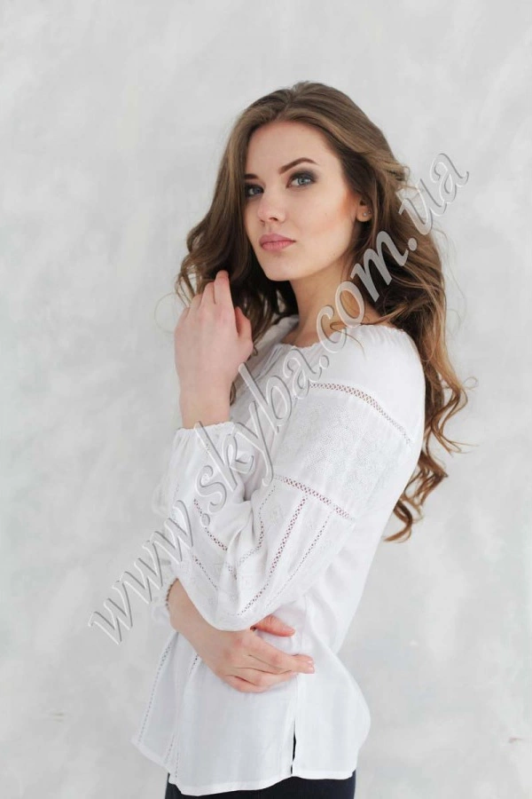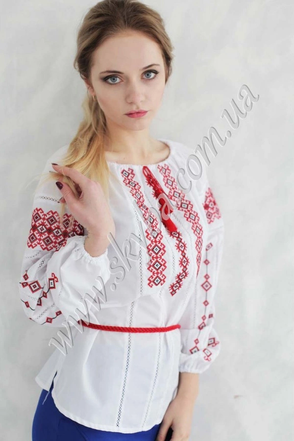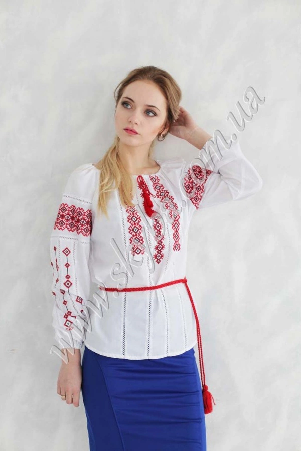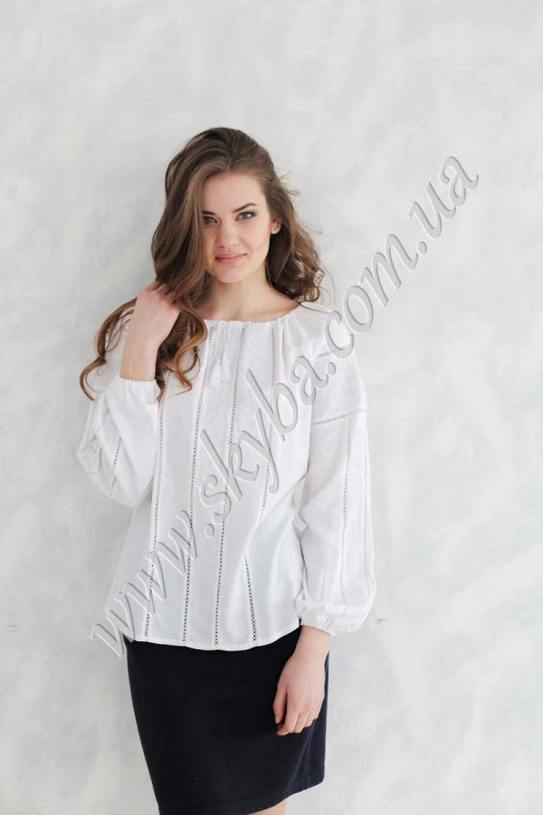 Ніжна жіноча блуза з вишивкою орнаментом на рукавах та грудях – неймовірна краса для створення дійсно жіночного образу. Зона декольте округлої форми затягується на тоненькому обрамленні, що дозволяє фіксувати самостійно потрібну форму. До сорочки Ви можете ще придбати якскравий пасочок.