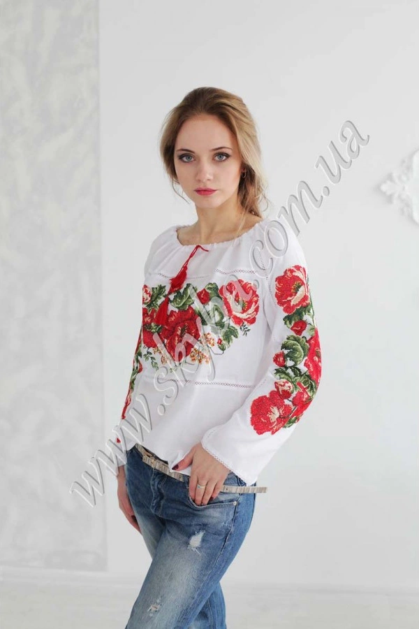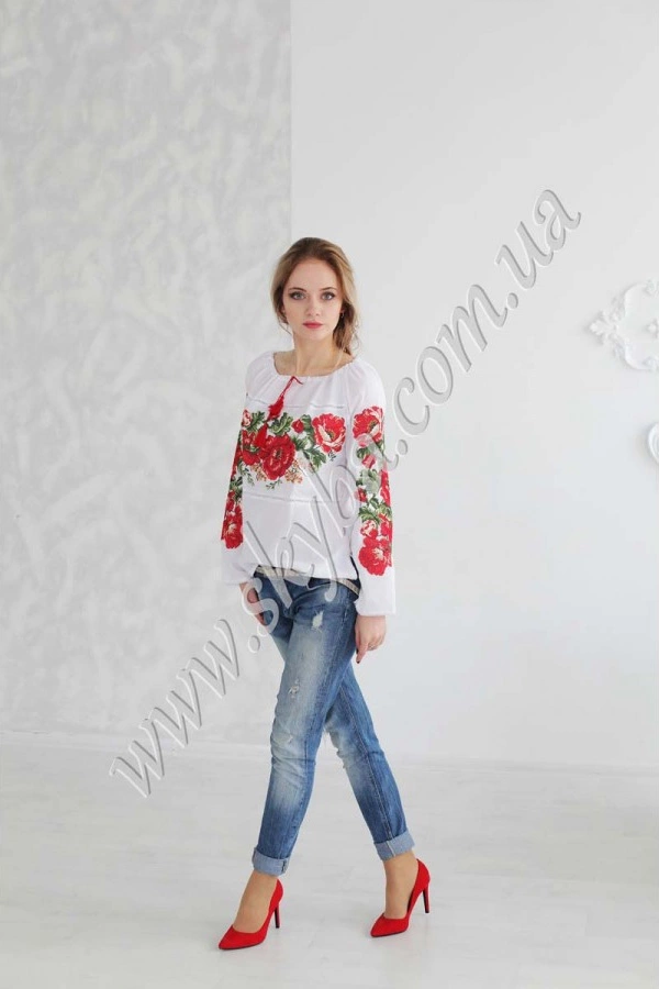 Вишиванка жіноча з яскравими червоними маками – справжня знахідка для створення святкового стильного образу. Розширені до низу рукави додають моделі особливої легкості та універсальності. Зона комірця має круглий виріз та прикрашена тоненьким ніжним обрамленням. Зона комірця може затягуватись, тому сміливо експериментуйте з формами.
