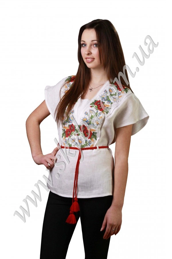 Жіноча блуза з короткими розширеними рукавами та з паском дозволить створювати дійсно стильні образи. Квіткова вишивка на передній частині рясно оздобляє блузу. Придбати виріб Ви можете з доставкою у будь-який куточок України.