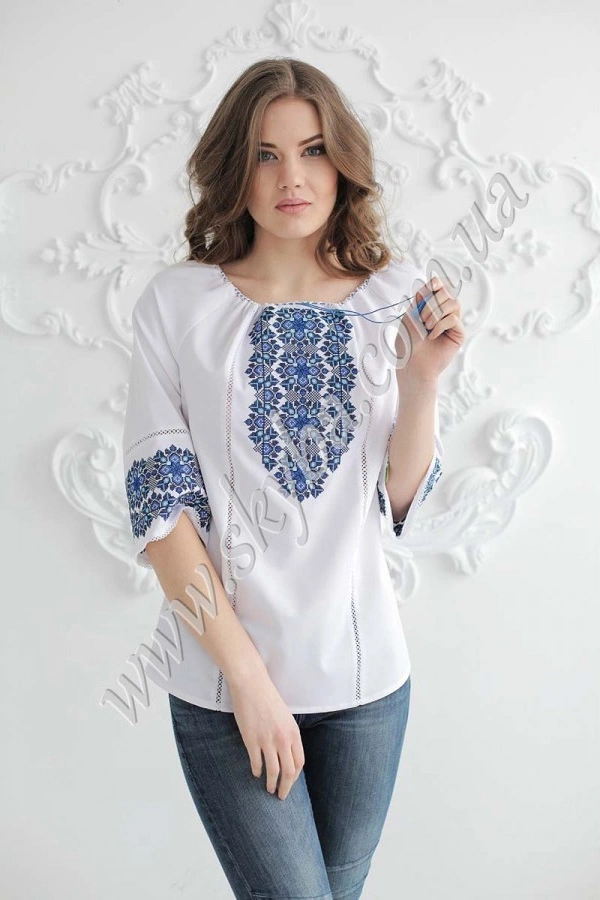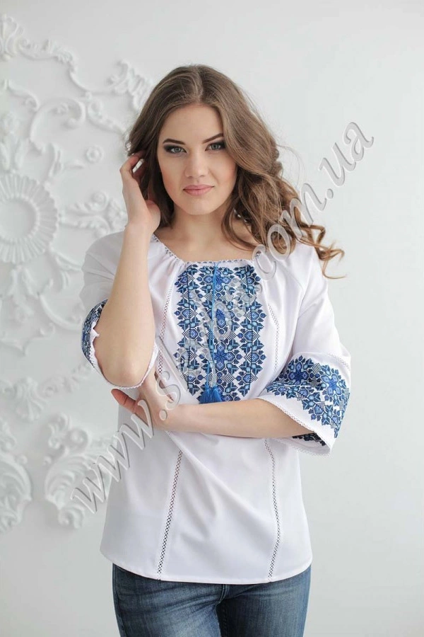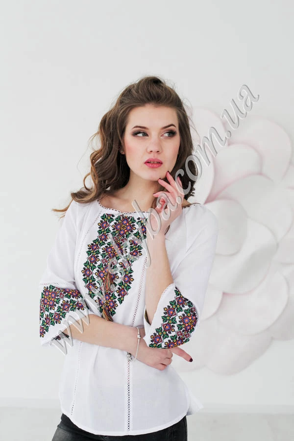 Ніжна жіноча блуза з вишивкою на нижній частині рукавів та на грудях доповнена лаконічним обрамленням у комірній зоні, що дає можливість стягувати блузу у верхній частині та експериментувати з формою. Рукав три чверті розширений до низу, а м’яка на дотик тканина створює максимальний комфорт навіть у найбільшу спеку.