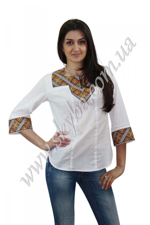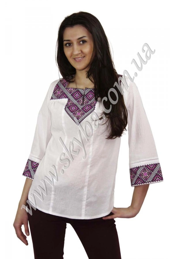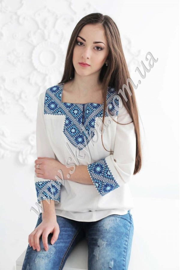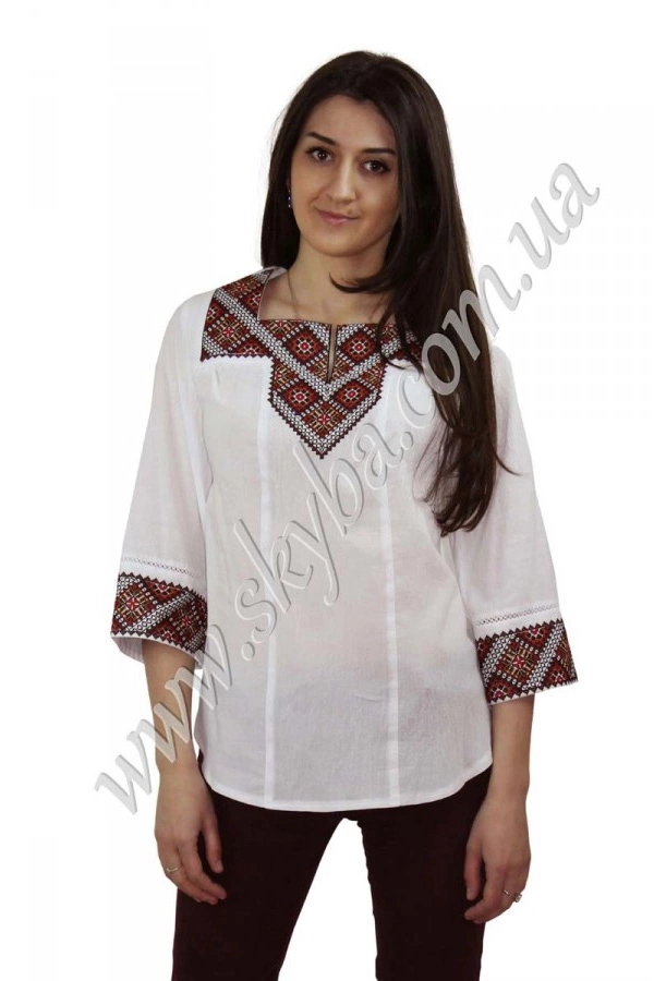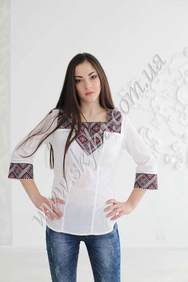 Геометричні малюнки даної моделі роблять її надзвичайно оригінальною та пізнаваною серед сотень інших. Рукав три чверті, прикрашений цілісною вишивкою розширений до низу, що дозволяє поєднувати блузу з одягом у будь-якому стильні. Жіноча блуза в наявності у всіх розмірах.