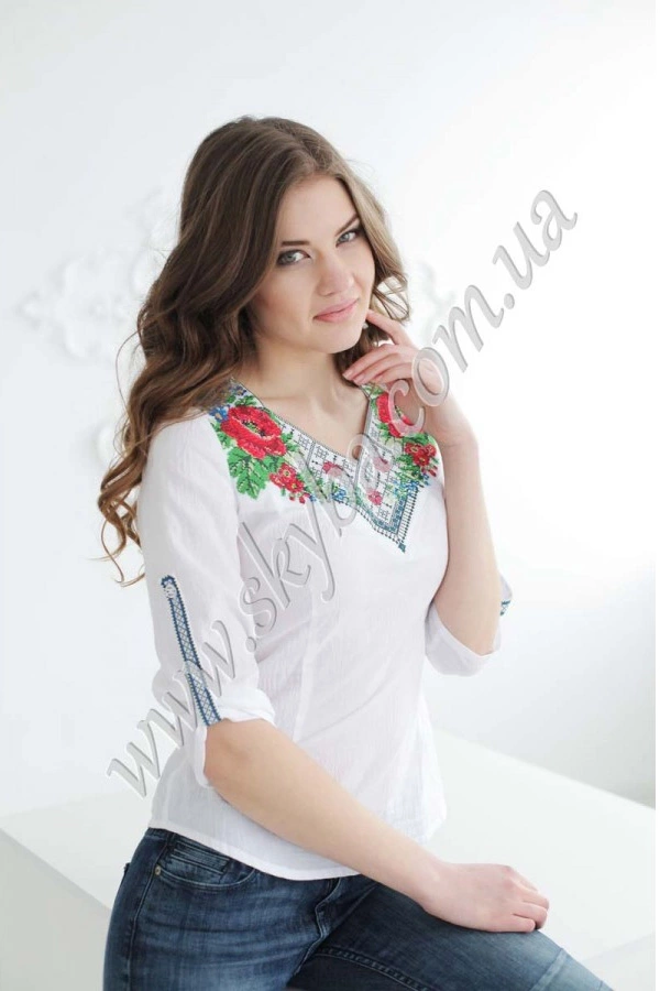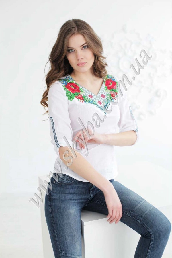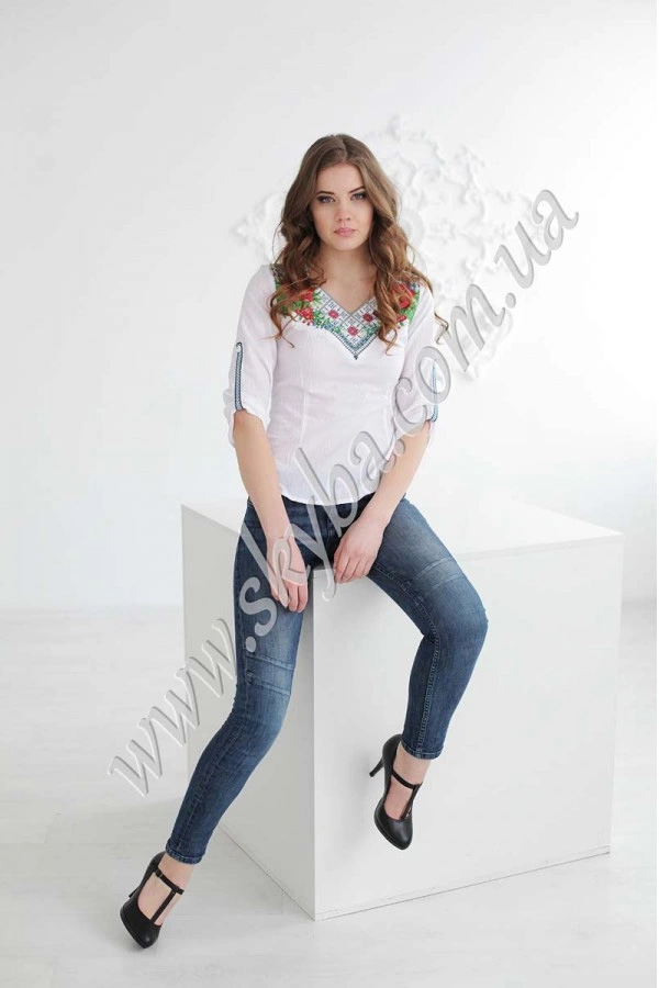 Жіноча блуза з вишивкою приталеного крою, з рукавами три чверті – універсальне доповнення для будь-якого образу. Можете успішно поєднувати блузу з джинсами, класичними штанами та спідницями. Квіткова вишивка на комірній зоні робить модель дійсно багатою та жіночною.