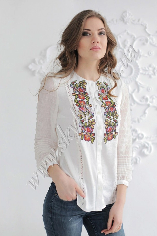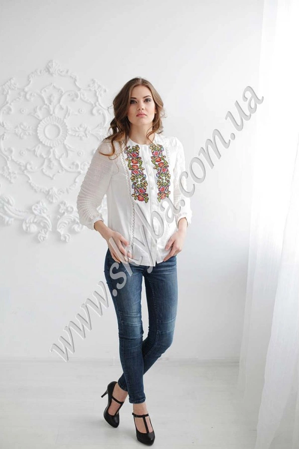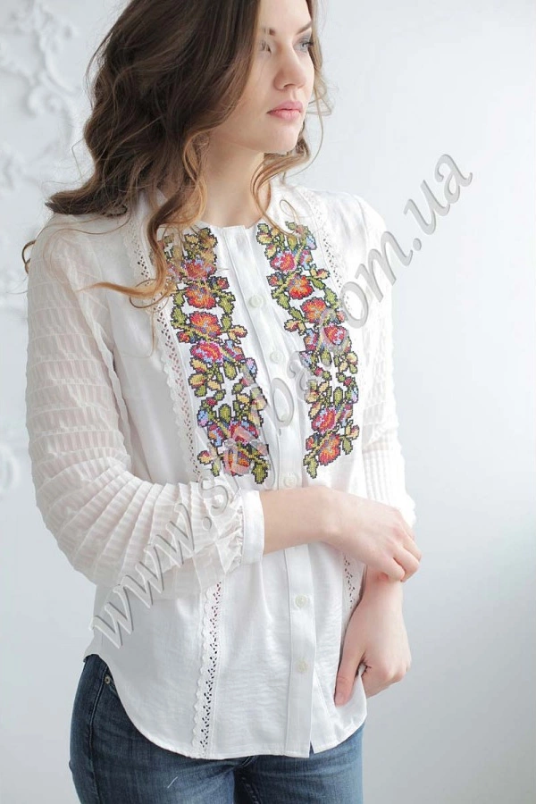 Квіткова вишивка на передній частині сорочки додає моделі ніжності