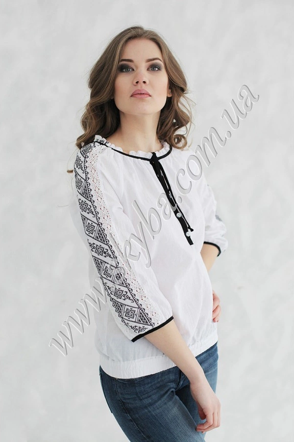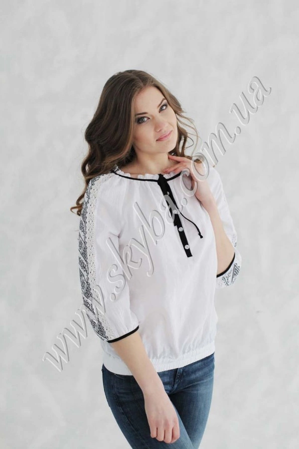 Мереживо на рукавах, жатка у комірній зоні та обрамлення чорними тоненькими вставками. Все це робить жіночу вишиванку неймовірно оригінальною та стильною. В інтрнет-магазині «Скиба» Ви можете купити жіночу блузу з вишивкою в такому виконанні просто зараз, обравши потрібний розмір виробу.