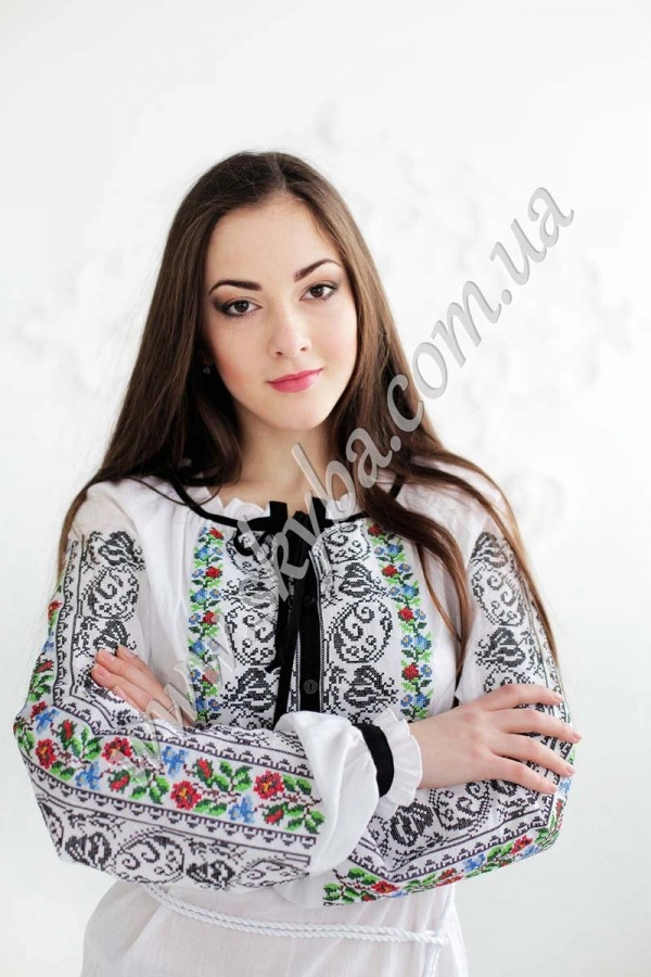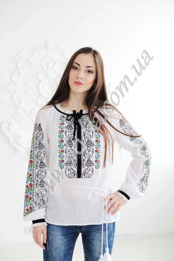 Розкішна жіноча вишиванка з хвилеподібними рюшами на рукавах та рясно вкритою автентичною вишивкою на передній частині сорочки, гармоніюватиме з будь-яким одягом. Розширені до низу рукави прикрашено яскравим обрамленням. Також під дану модель ми рекомендуємо підібрати яскравий пасок.