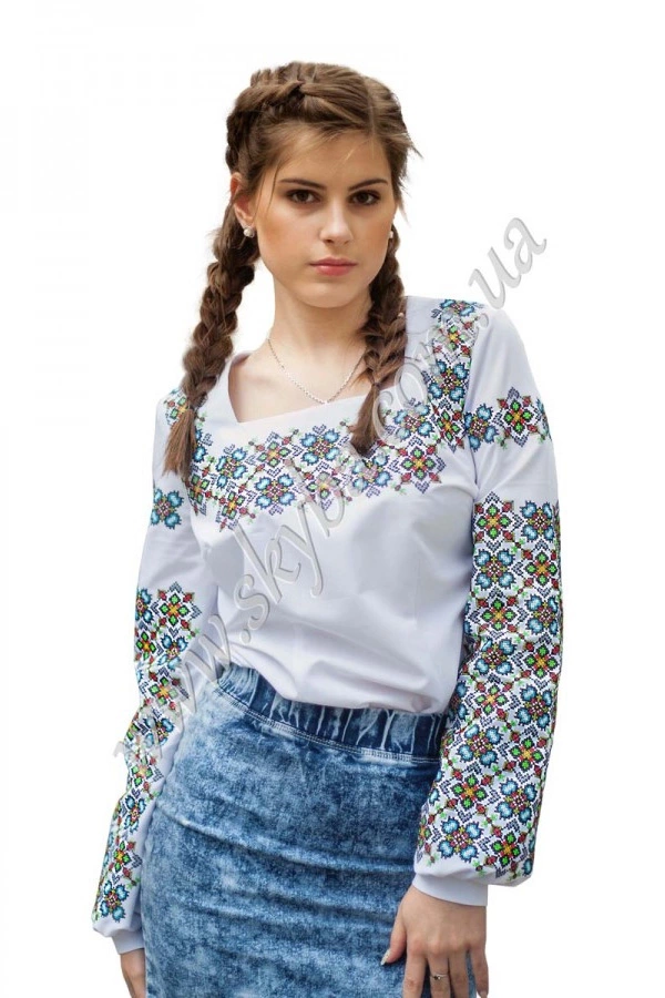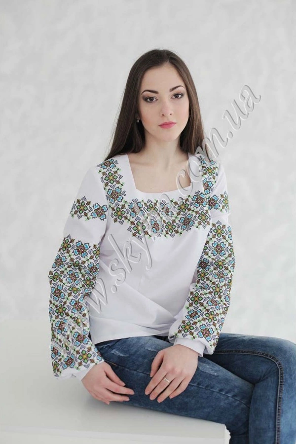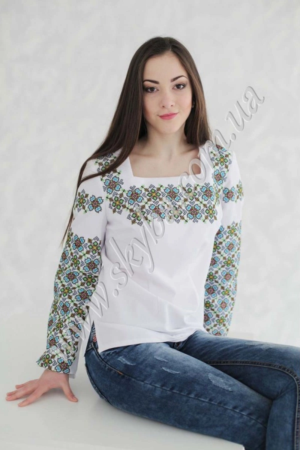 Жіноча блуза з вишивкою прикрашена рясним та виразним малюнком, який займає майже усю площину рукавів та комірну частину. Квадратний виріз додає блузі оригінальності, а звужені до низу рукава роблять особливий акцент на багатстві самого малюнка та пишноті рукавів по усій довжині.