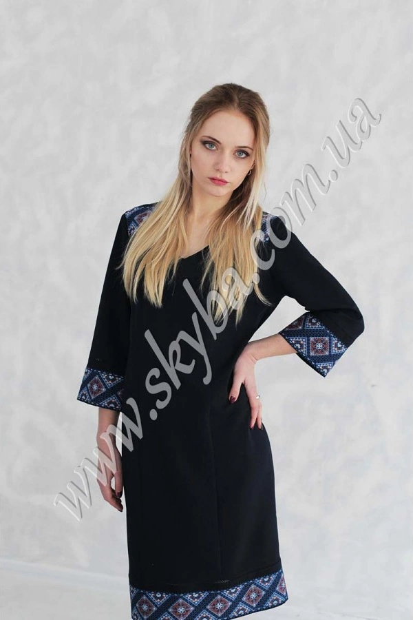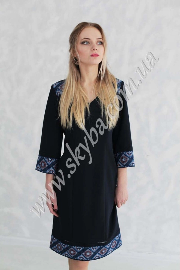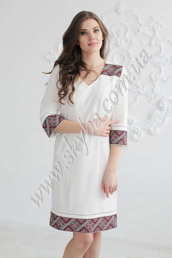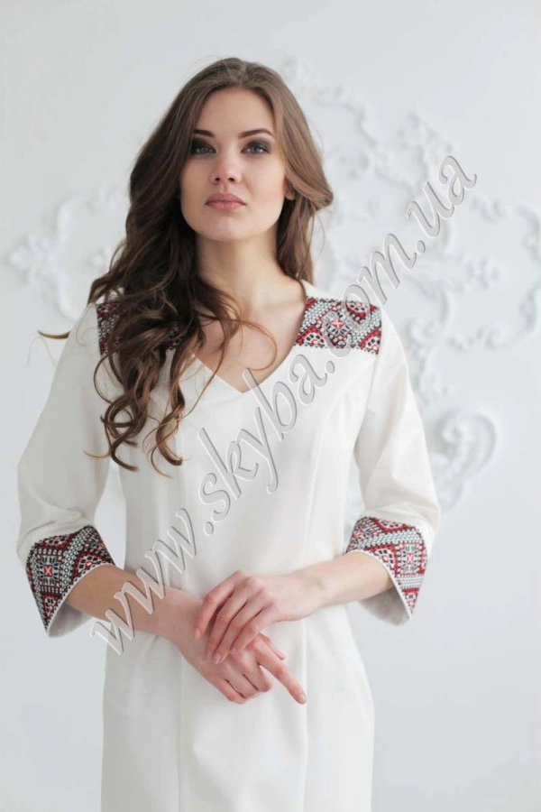 Сукня вишиванка вільного крою прикрашена дизайнерською вишивкою, розробленою ексклюзивно для даної моделі. Широкі манжети, поділ та плечова частина прикрашені автентичним орнаментом. Ніжності сукні додає тоненька мережка по усій довжині та у вигляді горизонтальних вставок.