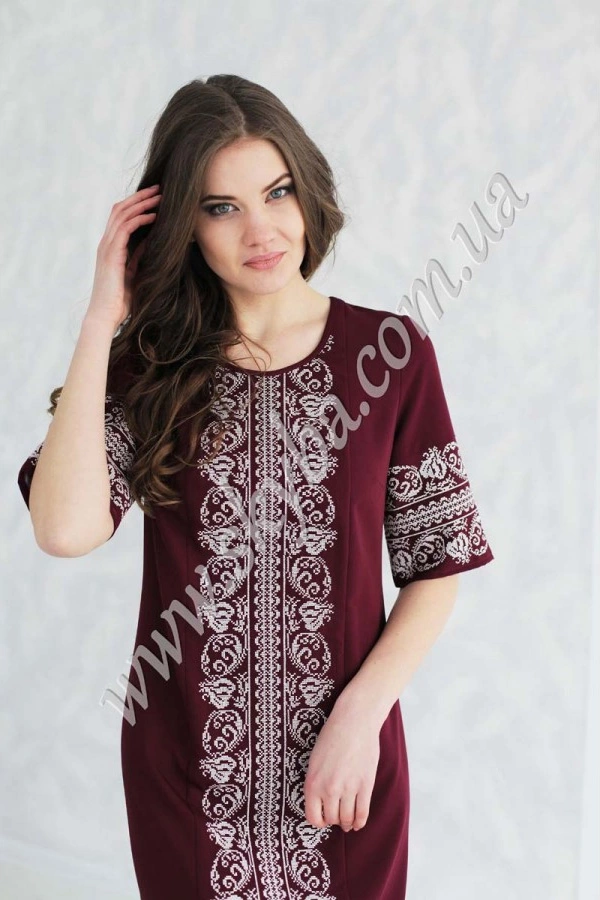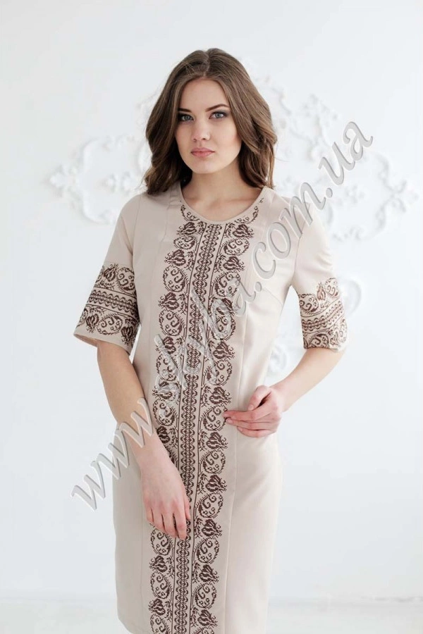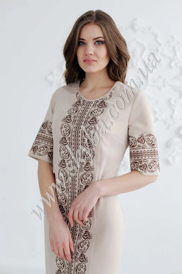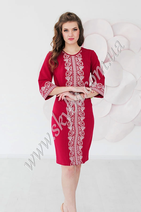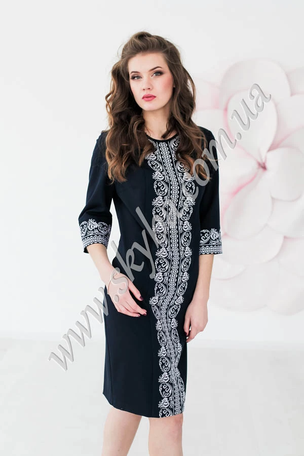 Розкішна сукня вишиванка підкреслить обриси жіночої фігури та одночасно дозволить створити образ ділової леді. Розширені до низу рукави прикрашені дизайнерскою вишивкою, яка повторюється також по усій довжині сукні. Обрати сукню Ви можете у потрібному розмірі та кольорі.