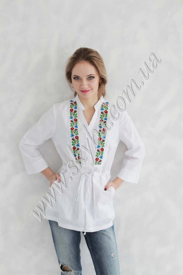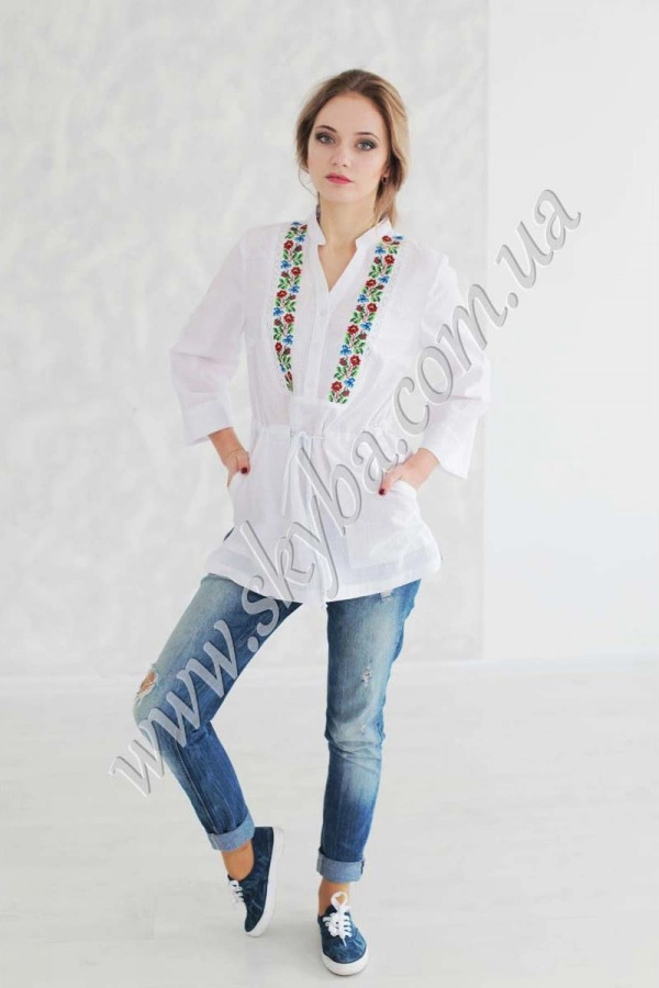 Жіноча туніка вільного крою чудово виглядає у поєднання з джинсами та брюками. На талії туніка затягується, тому Ви зможете самостійно регулювати форму та посадку. Автентична вишивка додає туніці ніжності та елегантності. Комірець-стійка є стильним доповненням даної моделі.