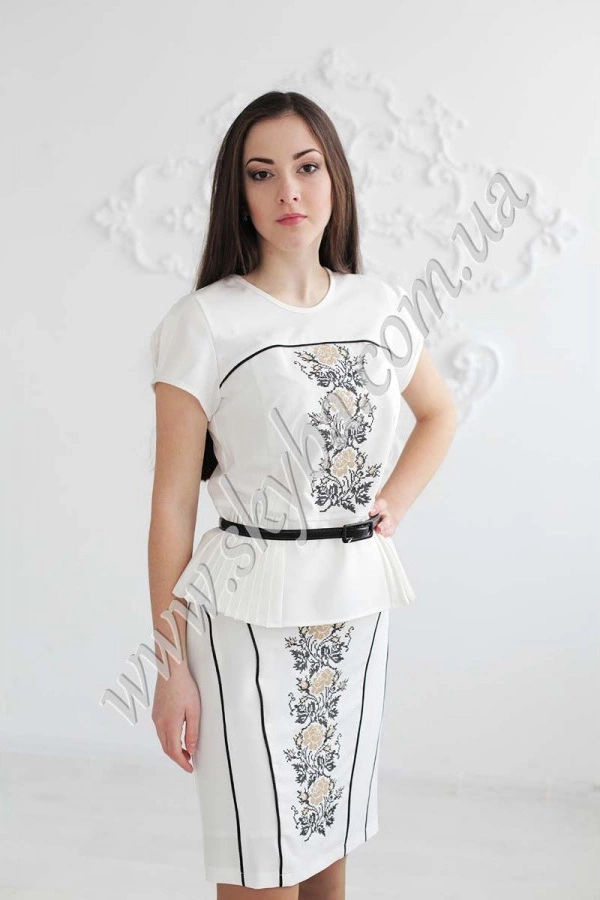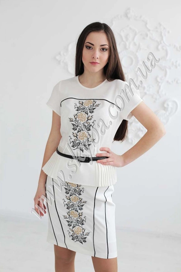 Жіночий костюм з вишивкою та плісировкою на нижній частині кофтинки – чудовий вибір для створення образу ділової леді. Легка та м’яка костюмна тканина створює максимальний комфорт навіть у сильну спеку. Купити жіночий костюм ми пропонуємо у потрібному Вам розмірі з доставкою у будь-який куточок України.